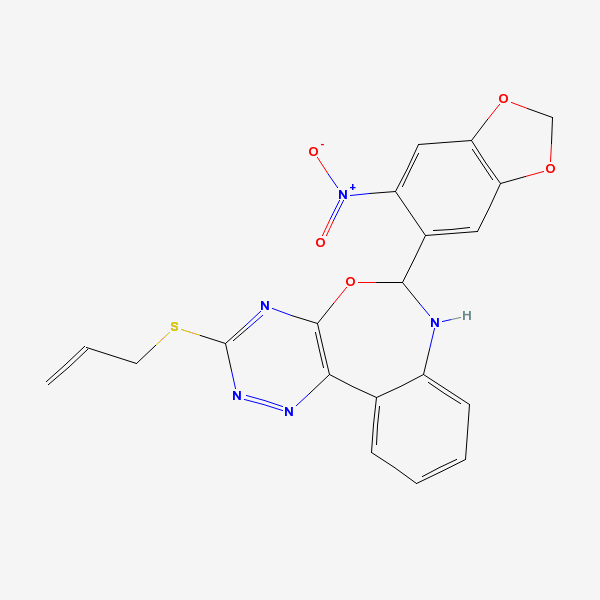 SMILES: C=CCSC1=NC2=C(C3=CC=CC=C3NC(O2)C4=CC5=C(C=C4[N+](=O)[O-])OCO5)N=N1