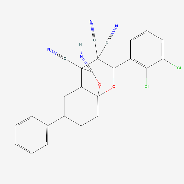 SMILES: C1CC23C(CC1C4=CC=CC=C4)C(C(=N)O2)(C(C(O3)C5=C(C(=CC=C5)Cl)Cl)(C#N)C#N)C#N