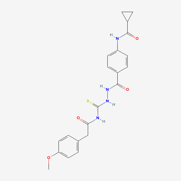 InChI: InChI=1/C21H22N4O4S/c1-29-17-10-2-13(3-11-17)12-18(26)23-21(30)25-24-20(28)15-6-8-16(9-7-15)22-19(27)14-4-5-14/h2-3,6-11,14H,4-5,12H2,1H3,(H,22,27)(H,24,28)(H2,23,25,26,30)/f/h22-25H