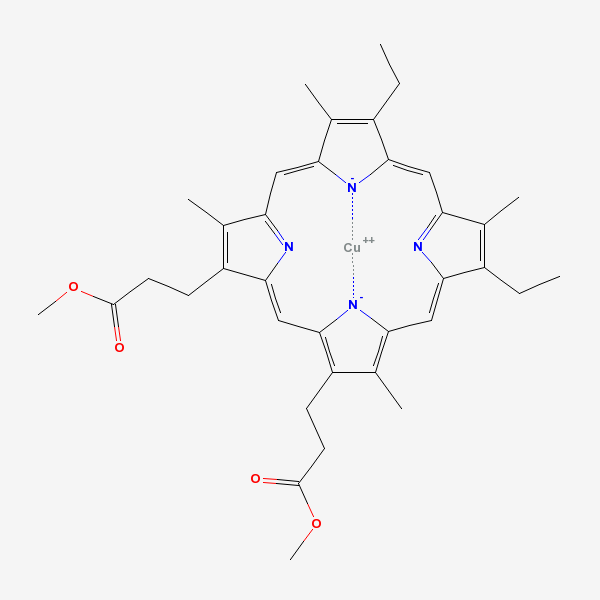 InChI: InChI=1/C36H40N4O4.Cu/c1-9-23-19(3)27-15-28-21(5)25(11-13-35(41)43-7)33(39-28)18-34-26(12-14-36(42)44-8)22(6)30(40-34)17-32-24(10-2)20(4)29(38-32)16-31(23)37-27;/h15-18H,9-14H2,1-8H3;/q-2;+2/b27-15-,28-15-,29-16-,30-17-,31-16-,32-17-,33-18-,34-18-;