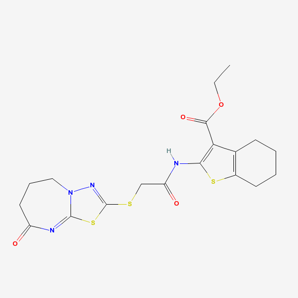 ethyl 2-[[2-[(5-oxo-8-thia-1,6,10-triazabicyclo[5.3.0]deca-6,9-dien-9-yl)sulfanyl]acetyl]amino]-4,5,6,7-tetrahydrobenzothiophene-3-carboxylate